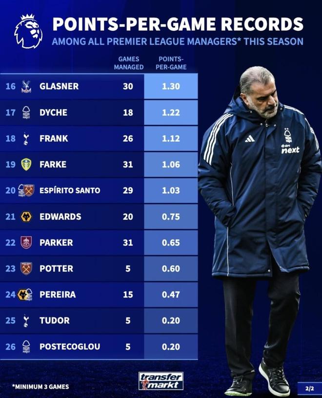 到了榜单末尾,帕克(0.65分)、波特(0.60分)、佩雷拉(0.47分)、图多尔和波斯特科格鲁(0.20分),这些数据已经不是“状态不好”能解释的了,而是球队已经彻底崩盘。尤其是狼队,进攻全联赛最差,主帅场均分不到0.5,这种数据组合在英超保级史上,基本就是“死刑宣告”。